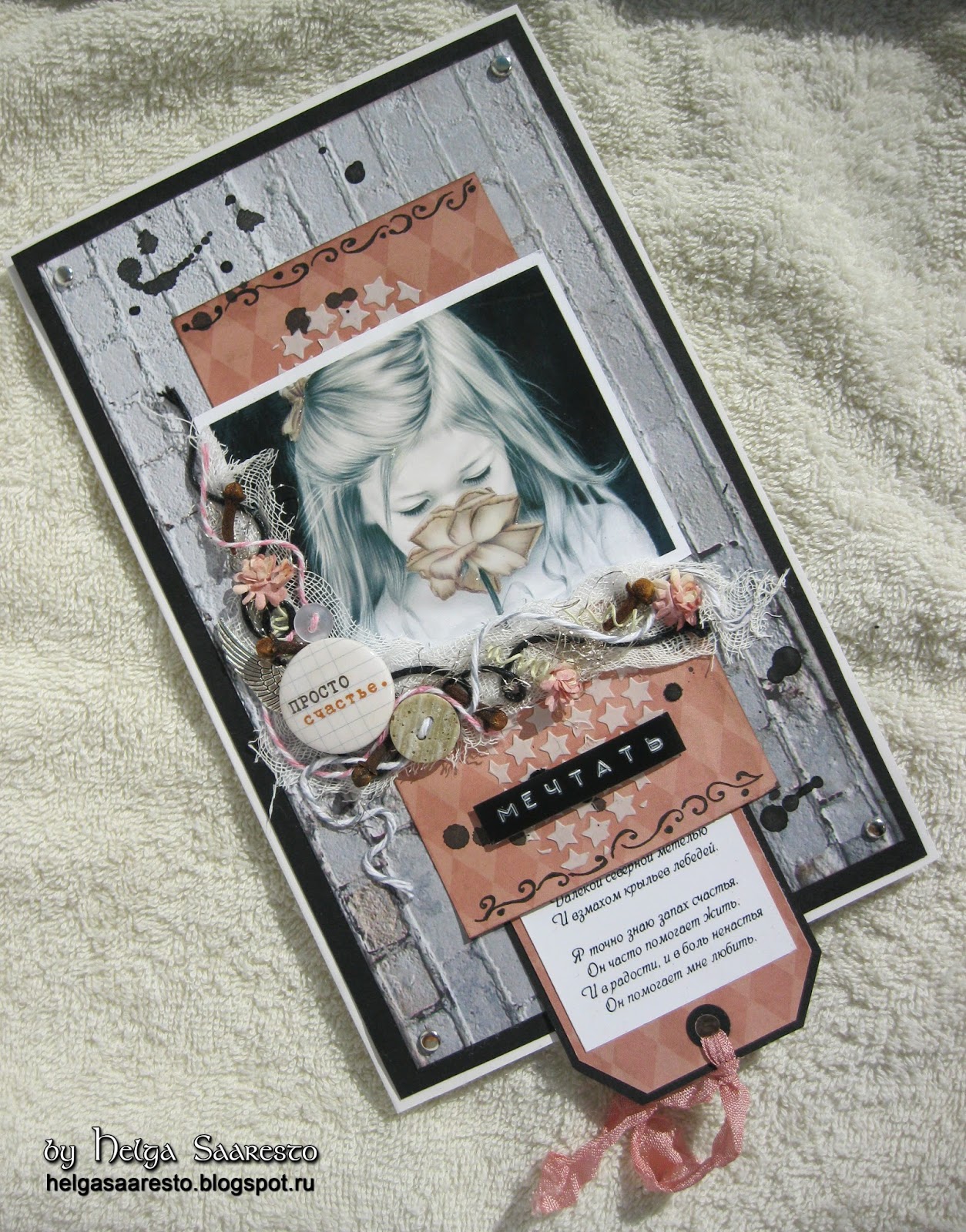 Топс, пуговицы, шнурки, "волосы ангела" (подарок Анжелики), гипсофилы, сухие ароматные гвоздички. А гипсофилы я пропитала духами с ароматом розы - открытка вся благоухает!)