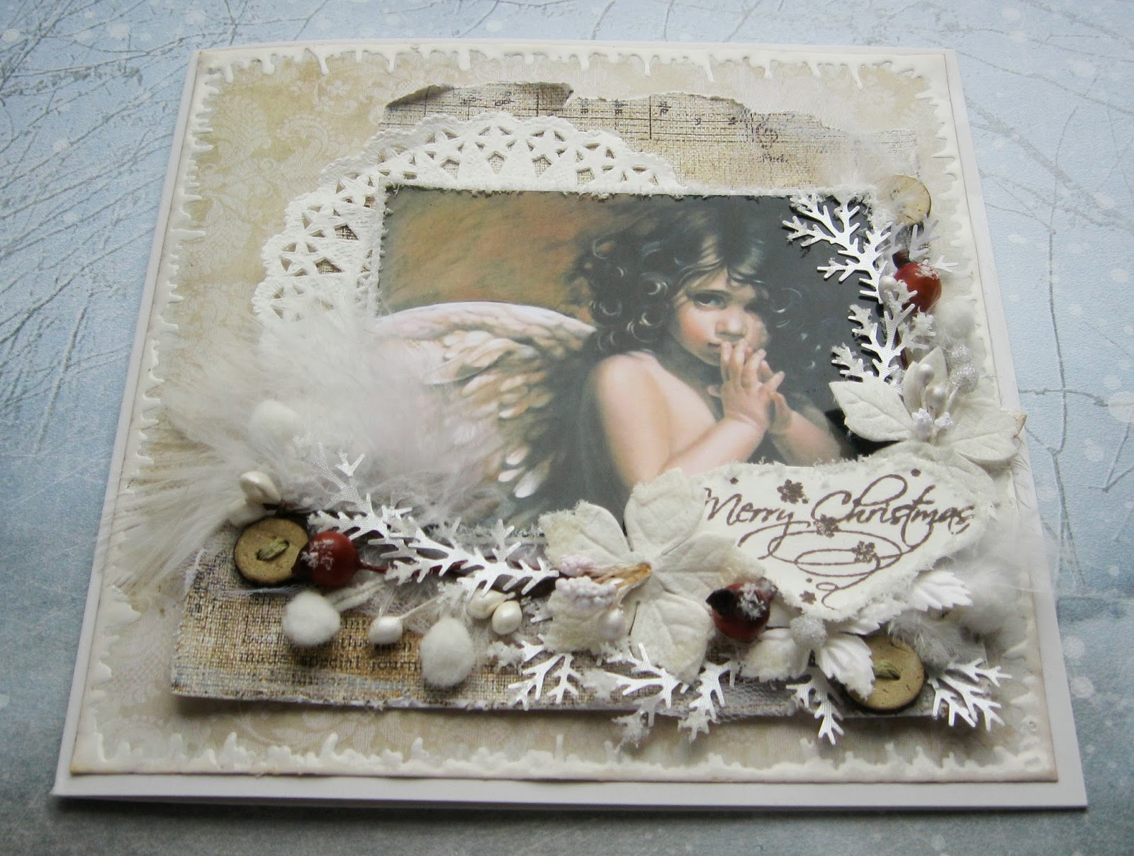 Фон я сделала с нуля - на текстурную пасту приклеила высушенные веточки ели, потом покрыла несколькими слоями белого акрила и побрызгала лаком для волос с серебряными блестками - на фото не передать, как фон сияет и переливается!!)))
