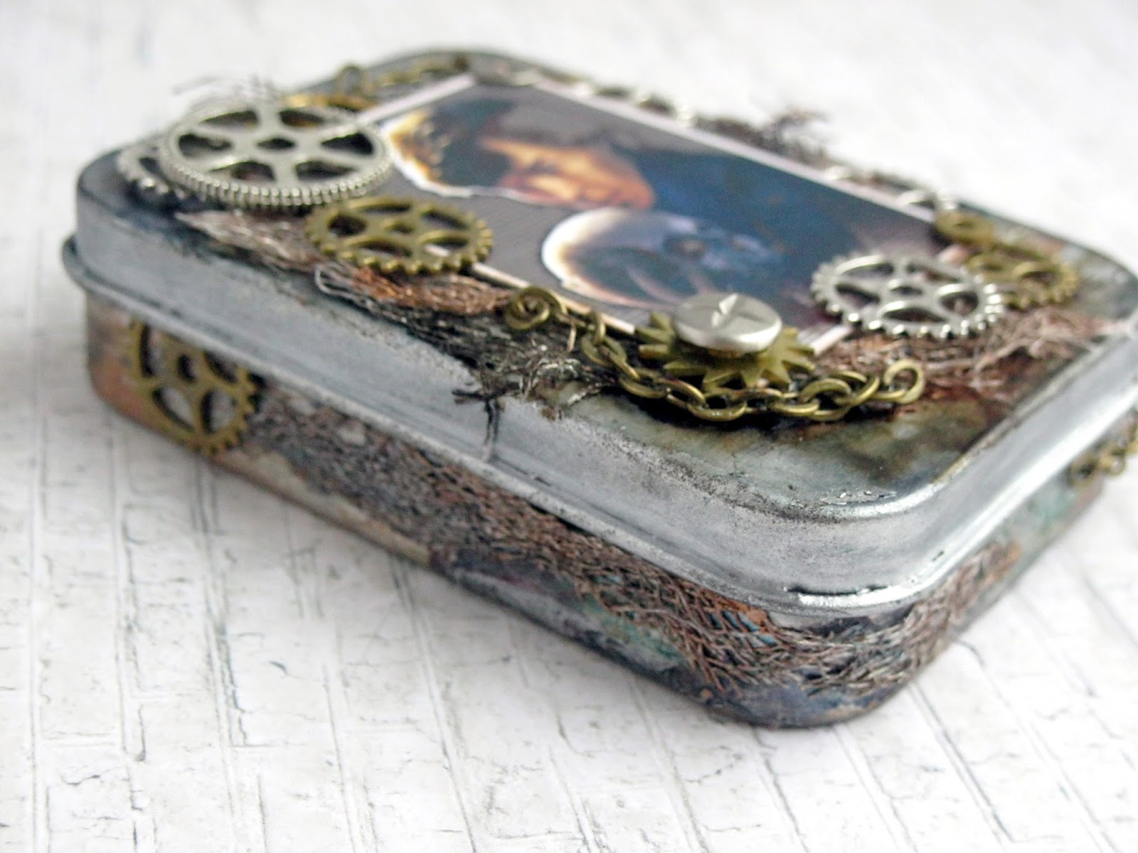 История создания))): сначала я покрасила коробочку серебристым металликом, потом слегка прошлась текстуркой - по крышке через маску, по бокам - просто пальцем. Следуя цветовой гамме фото, повозила акриловыми красками и алкогольными чернилами, края затонировала черными дистрессами. Марлю тоже покрасила акриловыми металликами - она под фото и немножко по бокам, цепочки тоже. Остальное - шестеренки, брадс и мелкие железяки.